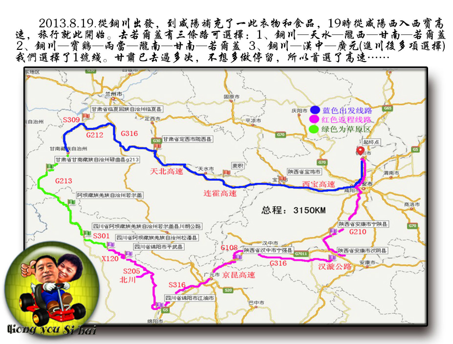 ### 第二天: "上午:" - 早餐后,从宝鸡出发,沿G30连霍高速继续西行。 - 行驶约100公里后,从宝鸡南出口驶出。