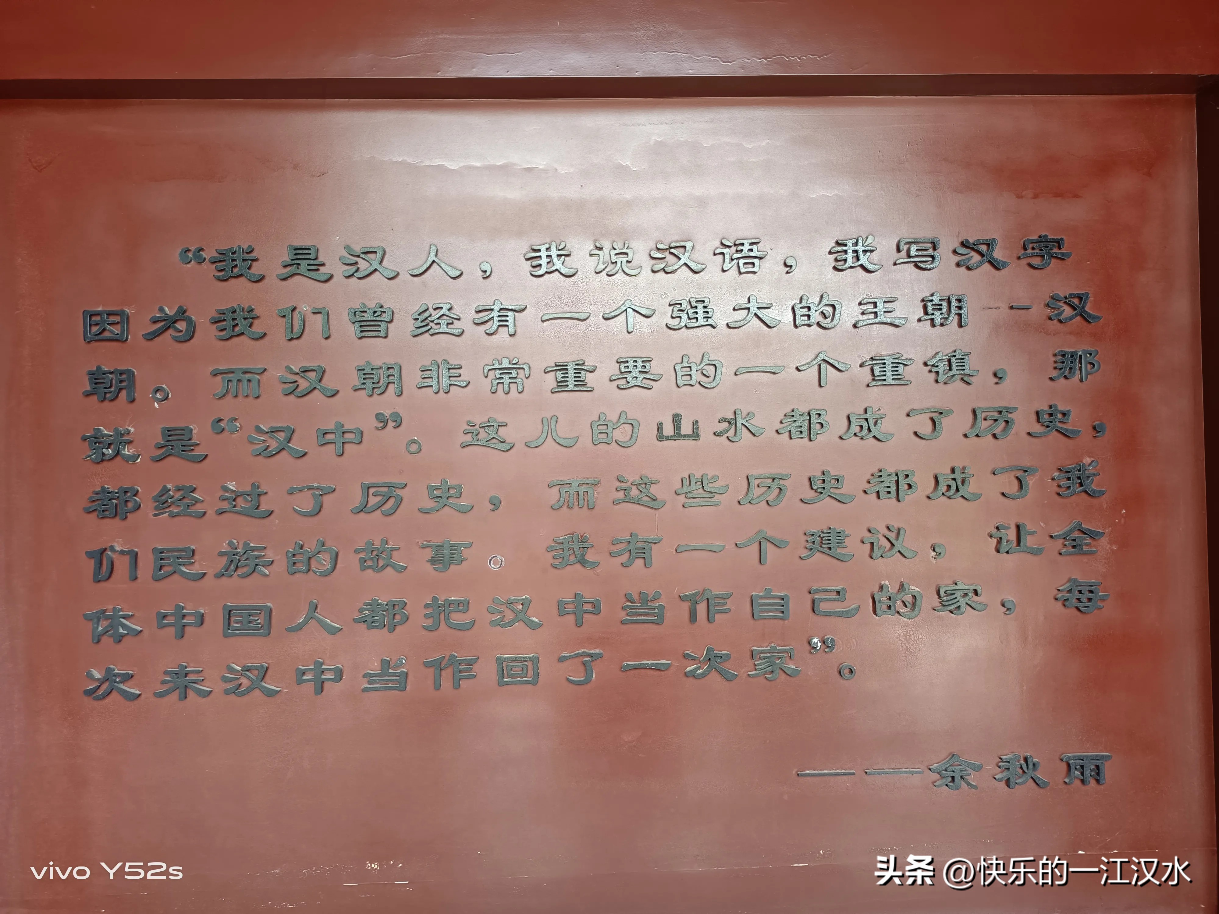 余秋雨先生多次到过汉中,并且视汉中为老家,大师有这样一段话说汉中:我是汉族,我说汉语,我写汉字,这是因为我们曾经有过一个伟大的王朝——汉朝。而汉朝一个非常重要的重镇,就是汉中。”他进一步呼吁:“让全体中国人都把汉中当作自己的老家,每次来汉中当作回了一次家。”
